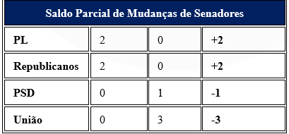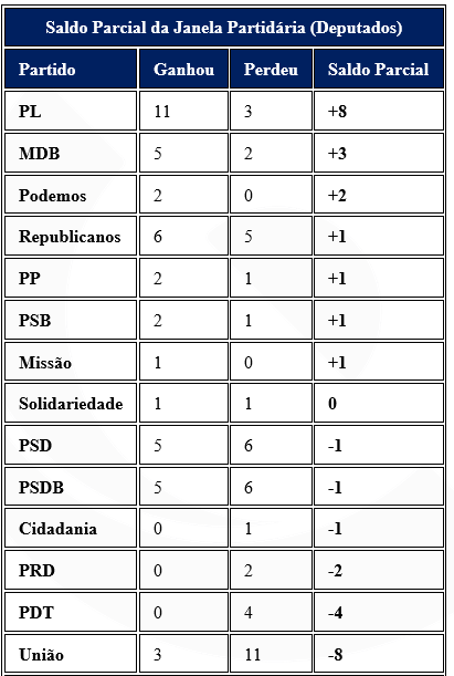 No sentido oposto, União Brasil e PDT figuram como os partidos com pior saldo líquido até o momento. Também merecem destaque PSD e PSDB que, embora registrem perda líquida de apenas uma cadeira, concentram um volume expressivo de saídas ao longo desta janela, evidenciando um movimento mais amplo de recomposição interna.