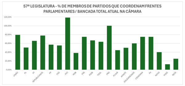 Contudo, é expressivo o interesse pela coordenação das frentes de membros dos partidos com as maiores bancadas, como o PL e PT. O União Brasil, com a 3ª maior bancada (58 deputados), lidera, porém, a lista, apresentado uma densidade mais elevada que PT e PL na criação de frentes.