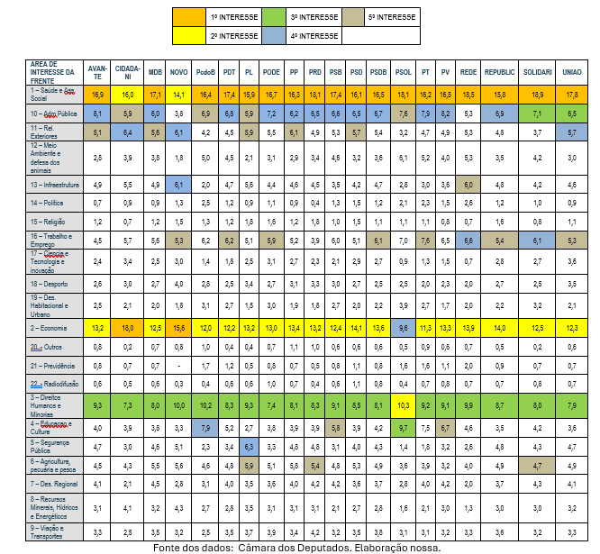 Temas econômicos são o segundo grupo mais importante, segundo esse critério de análise, para quase todos os partidos, exceto para Cidadania, Novo e PSOL. Para número expressivo de partidos o terceiro maior interesse está em temas de direitos humanos e minorias, exceto para o PSOL – que o coloca como segunda prioridade. Já a quarta área de interesse mais frequente é Administração e Serviços Públicos, exceto para o MDB, PCdoB e PSOL – que tem como 3ª prioridade educação e cultura –, PL, que tem como 3ª prioridade temas de segurança pública, e Solidariedade e União, para os quais Trabalho e Emprego e Relações Exteriores têm maior importância. Partidos historicamente relacionados aos interesses dos trabalhadores – PT e PDT – colocam esses temas em 5ª posição no que se refere ao número de participantes em frentes parlamentares.