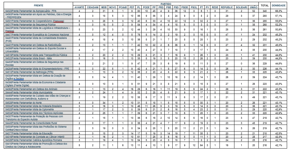 A composição de deputados federais de cada uma das frentes, por partido, que permite identificar o grau de adesão dos membros de cada partido a uma frente específica, e as respectivas densidades em relação ao total de membros da Câmara, pode ser observada no Anexo a esta análise.
