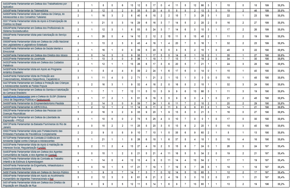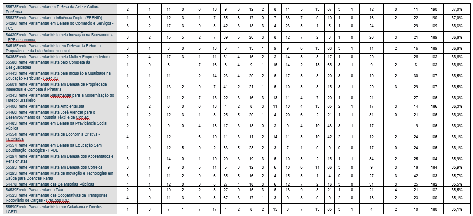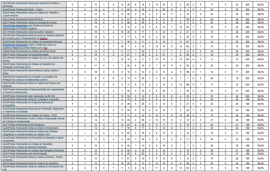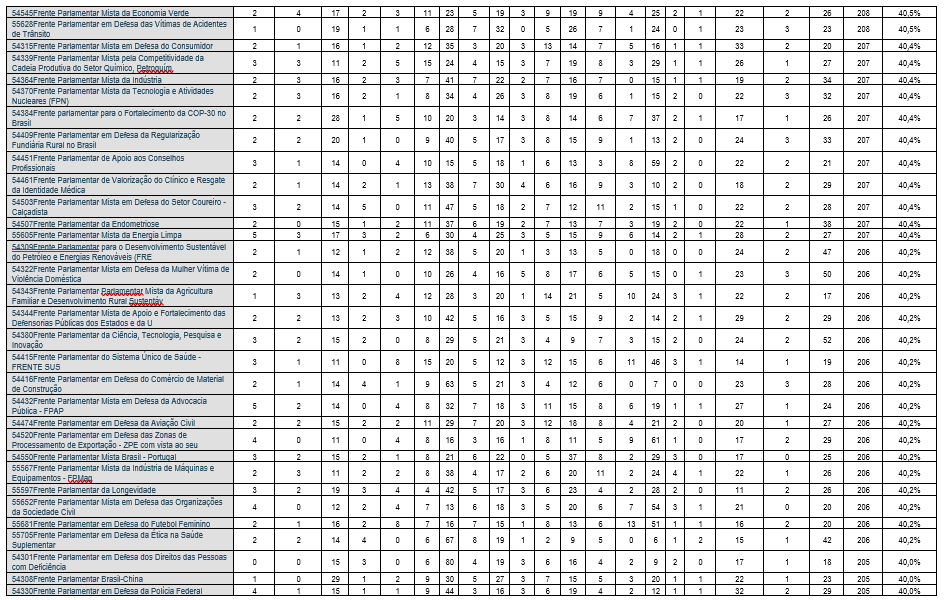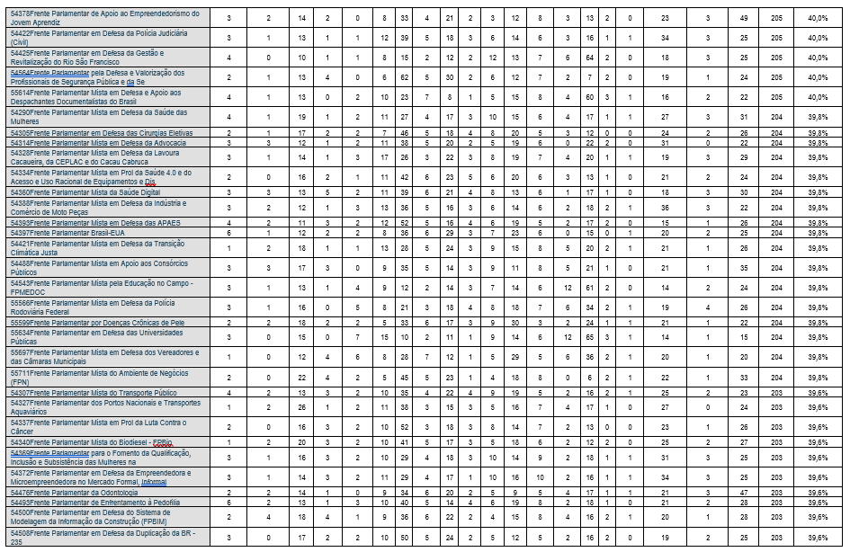 Contudo, essa densidade varia significativamente: as 5 frentes parlamentares com maior densidade apresentam percentual de participação formal superior a 50% da composição da Câmara dos Deputados, com a Frente Parlamentar da Agropecuária – FPA, popularmente chamada de “Bancada do Boi”, liderando o bloco, com 66,3% de densidade. A Frente Parlamentar da Segurança Pública, ou “Bancada da Bala”, tem 52,2%, e a Bancada Evangélica, a “Bancada da Bíblia”, vem em 6º lugar, com densidade de 45,2%. A média de participantes é de 204 deputados por frente, mas há uma disparidade baixa: a mediana é de 202 membros, e o valor modal, de 200 membros, com um número mínimo de 180 membros.