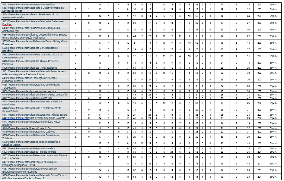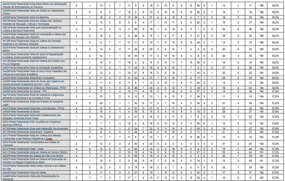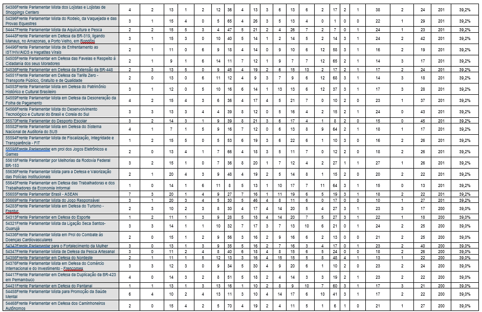 Na Câmara dos Deputados, em 07.03.2026, estavam registradas 314 Frentes Parlamentares[3], sendo 202 frentes parlamentares mistas e 112 frentes parlamentares exclusivas da Câmara dos Deputados. Contudo, das frentes parlamentares mistas, 24 não registravam nenhum membro do Senado Federal, ou seja, não atraíram a adesão dos membros da Câmara Alta[4].