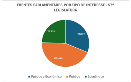 Quanto ao tipo de interesse que as frentes representam, nominalmente, há uma predominância de frentes que atuam em temas de interesse público (44%), ou misto (31%). Um menor percentual do total de frentes (25%) dedica-se de forma clara a defesa ou articulação de interesses do setor privado, essencialmente: