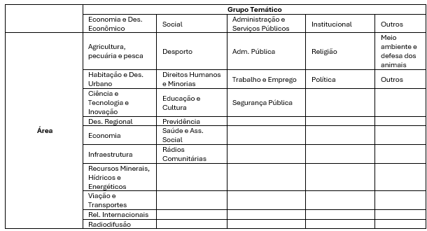 Quanto à classificação das Frentes por Áreas e Grupos temáticos, buscamos enquadrar as frentes registradas segundo os seguintes critérios, que observam, em grande medida, o já empregado em estudos anteriores por nós elaborados, relativos à 55ª e 56ª Legislaturas[5]:
