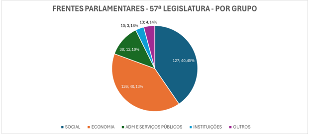 Segundo essa metodologia, as 314 frentes parlamentares da 57ª Legislatura registradas na Câmara dos Deputados até 07.03.2026 podem ser assim classificadas: