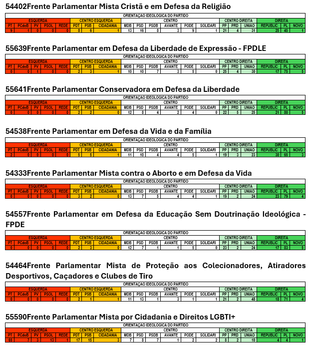 Examinando-se a sua composição por partidos, mostra-se evidente que o grau adesão a elas segue a afinidade com a ideologia partidária, segundo a classificação ideológica comumente aceita[6], ou seja, parlamentares de partidos de esquerda, ou centro esquerda, tem baixa participação em frentes com perfil ideológico de direita, e vice-versa: