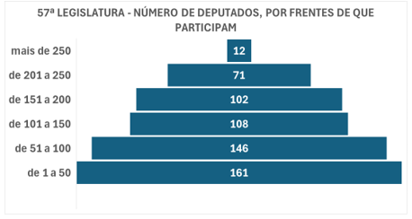 Ao longo da legislatura, 600 deputados participaram ou participam de frentes; esse número decorre do fato de que, ao longo dos 3 anos a partir do início da 57ª Legislatura, deputados se licenciaram por razões diversas, faleceram, foram cassados ou renunciaram ao mandato para assumir outro cargo eletivo, ou mesmo para assumir cargo público em outro órgão (como no Tribunal de Contas da União, ou se licenciaram para exercer cargo de Secretário estadual ou municipal, ou de Ministro de Estado, hipóteses em que assumiu o suplente.